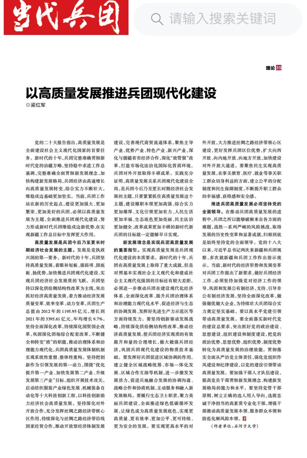 党的二十大报告指出,高质量发展是全面建设社会主义现代化国家的首要任务。新时代的十年,兵团完整准确贯彻新时代党的治疆方略,坚持稳中求进工作总基调,完整准确全面贯彻新发展理念,加快构建新发展格局,兵团经济由高速增长向高质量发展转变,综合实力不断壮大,维稳戍边基础更加坚实。当前,兵团工作站在新的历史起点,建设更加强大、更加繁荣、更加美好的兵团,必须以高质量发展为主题,全面推进兵团现代化建设,努力形成新时代兵团维稳戍边新优势,在实现新疆工作总目标中发挥更大作用。